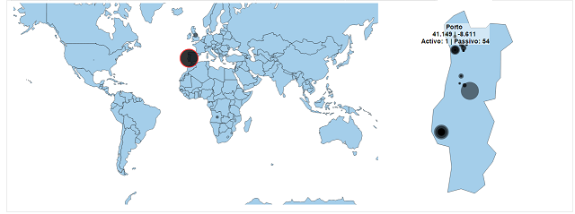 Mapa de bolhas de acessos por localização. Mapa principal mostra acessos por país